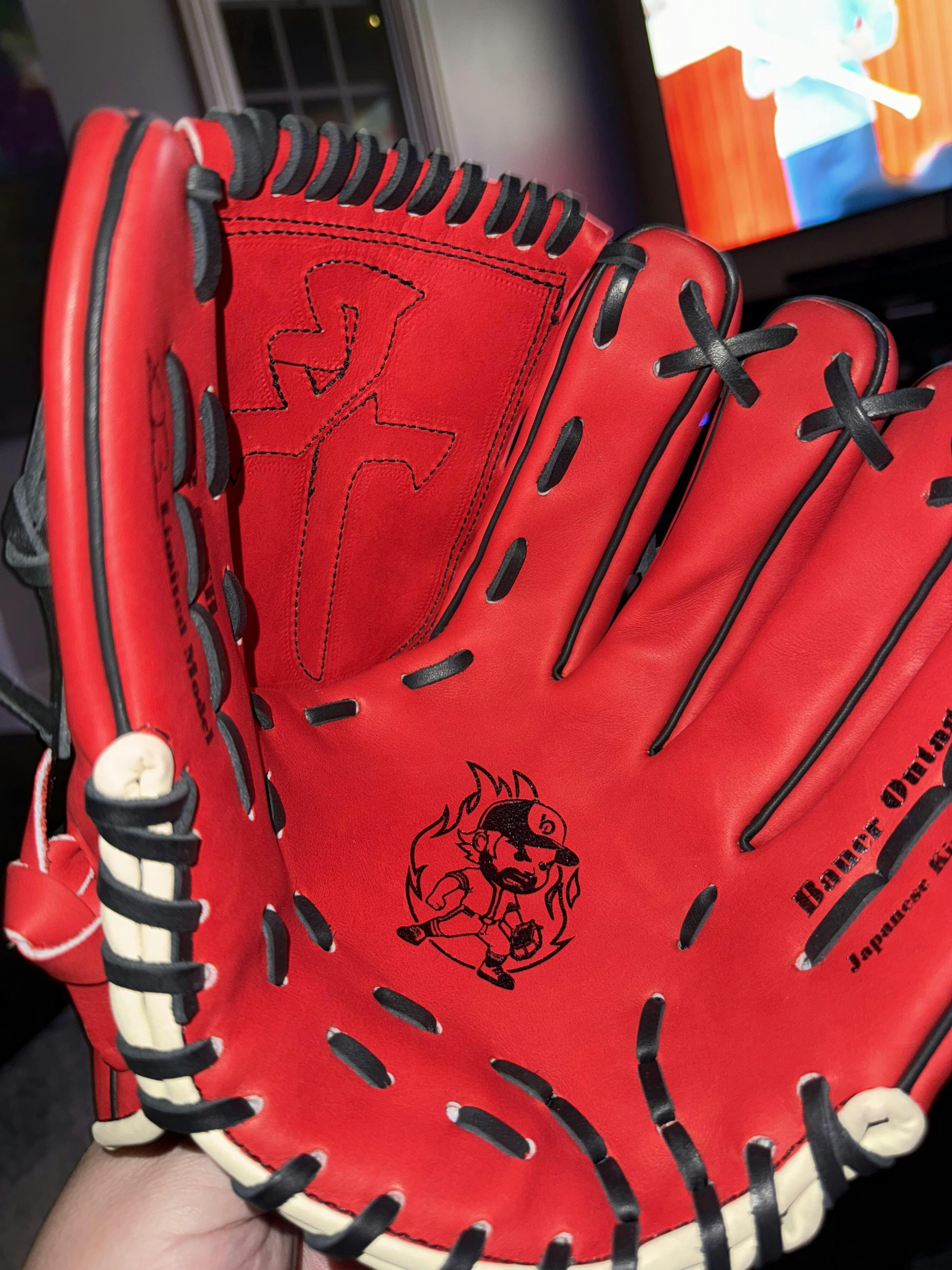 Only 30 made. Each glove is individually numbered 1–30. Trevor Bauer’s actual game model — built from pro-grade Japanese Kip leather with a bold crimson finish and “Firewood” stitched into the thumb.